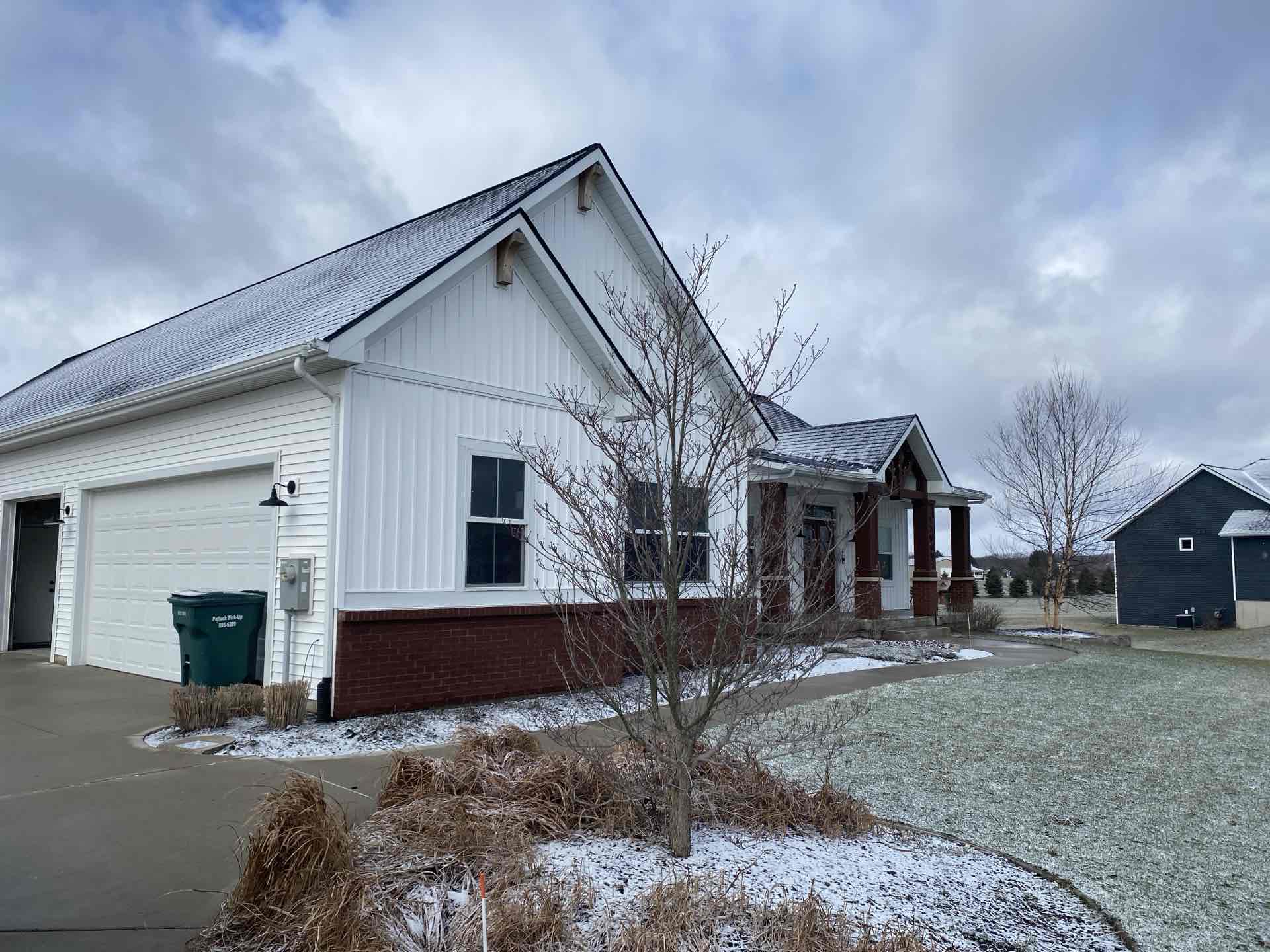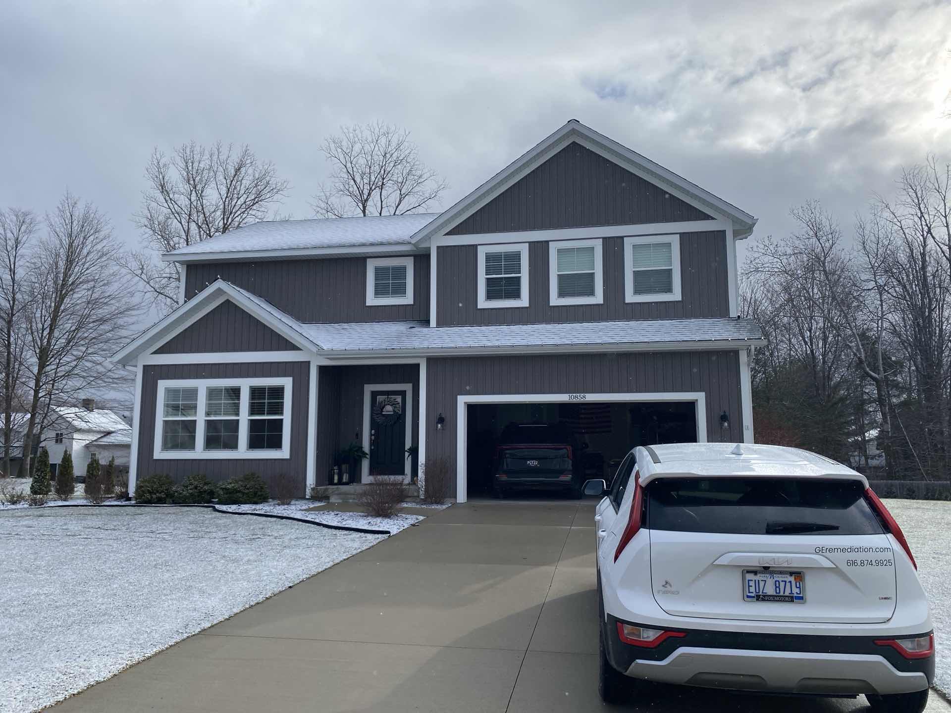 Happy home, saved from radon gas exterior system placed on the side of the home behind the garage bump out.